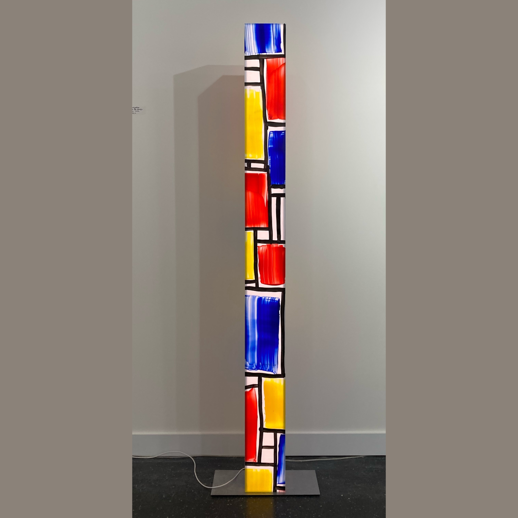 Dit vrolijke lichtobject met Mondriaan-achtige beschildering is gemaakt van gerecycled materiaal. De koker is aan volledig handgeschilderd, genummerd en gesigneerd en staat op een metalen zilverkleurige voet. De LED verlichting gaat ongeveer 20 jaar mee als het object continu aan staat. Je krijgt er een dimmer bij zodat je het licht kunt aanpassen aan de ruimte en je stemming.