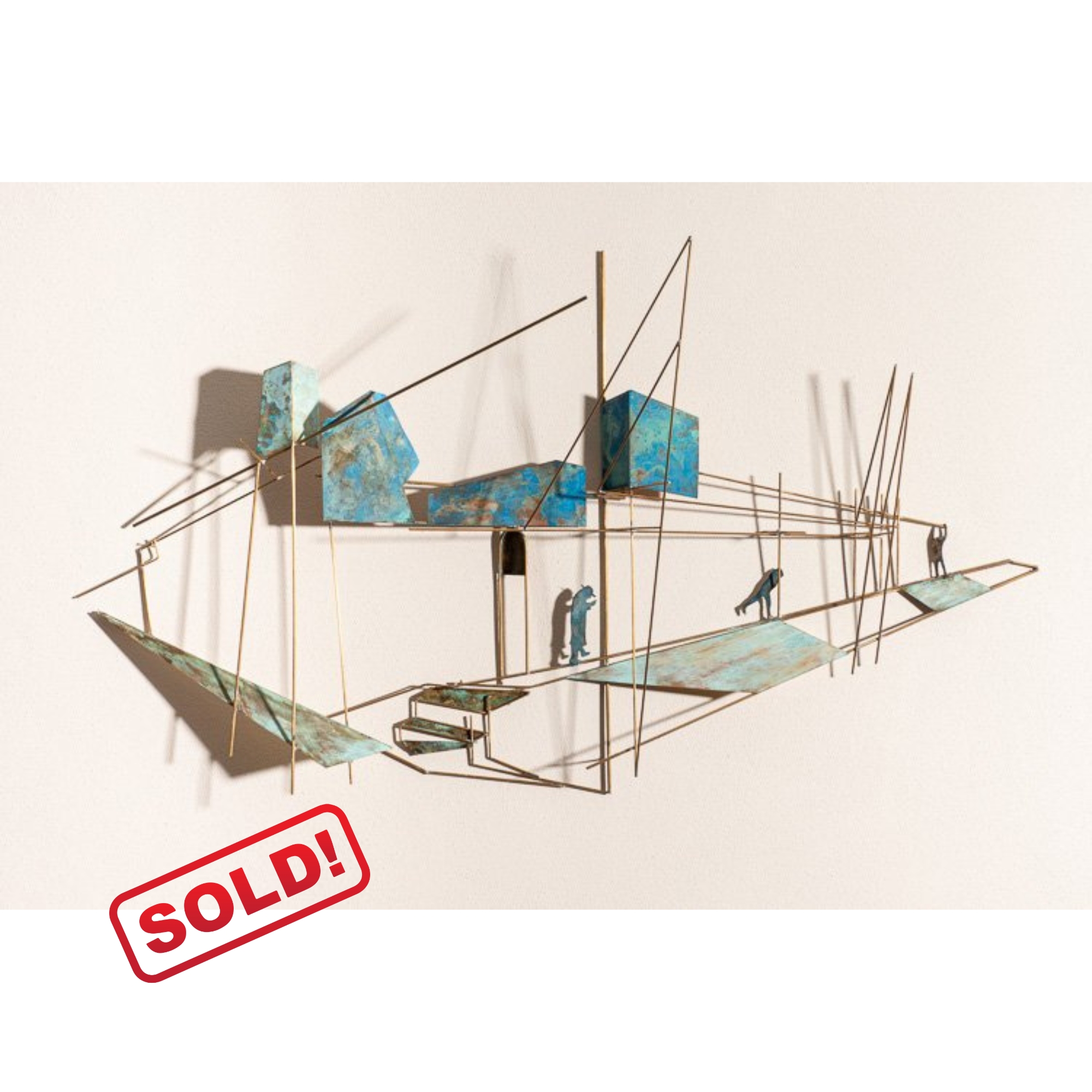 Lopend langs de kade is een bijzonder wandobject van Leni van den Band. Het is gemaakt van messing en koper, en de patina zorgt voor het oxidatie effect. Het kunstwerk geeft weer dat we door de drukte steeds minder in alle rust een wandeling langs de kade maken. Omdat het werk driedimensionaal is, ontstaat bij de juiste belichting een bijzonder spel van licht en schaduw.