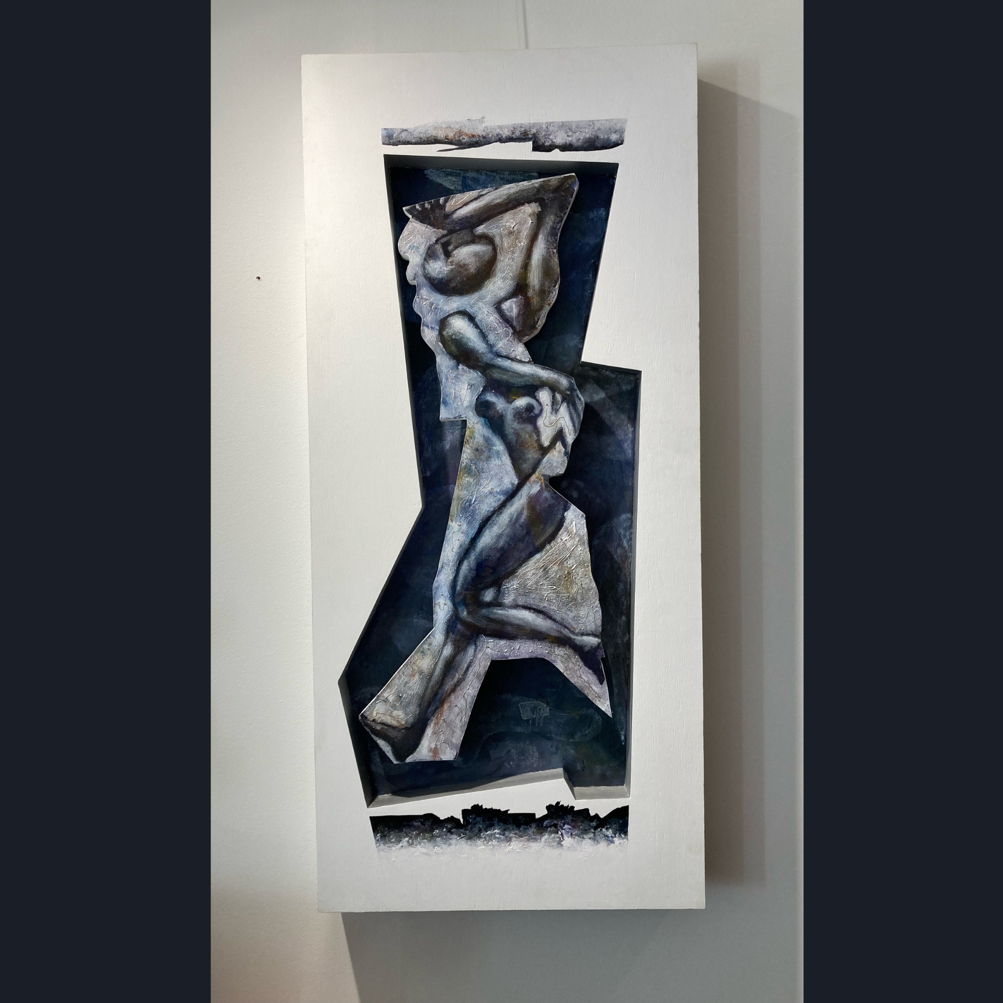 Uniek kunstwerk van gemengde technieken dat iemand voorstelt die gevangen zit. De omlijstende bak is wit beschilderd, terwijl het paneel is beschilderd met acryl, olieverf en potlood. Dit muurwerk komt het best tot zijn recht in een wat grotere ruimte bij een liefhebber die houdt van een kunstwerk wat niet mainstream is.
