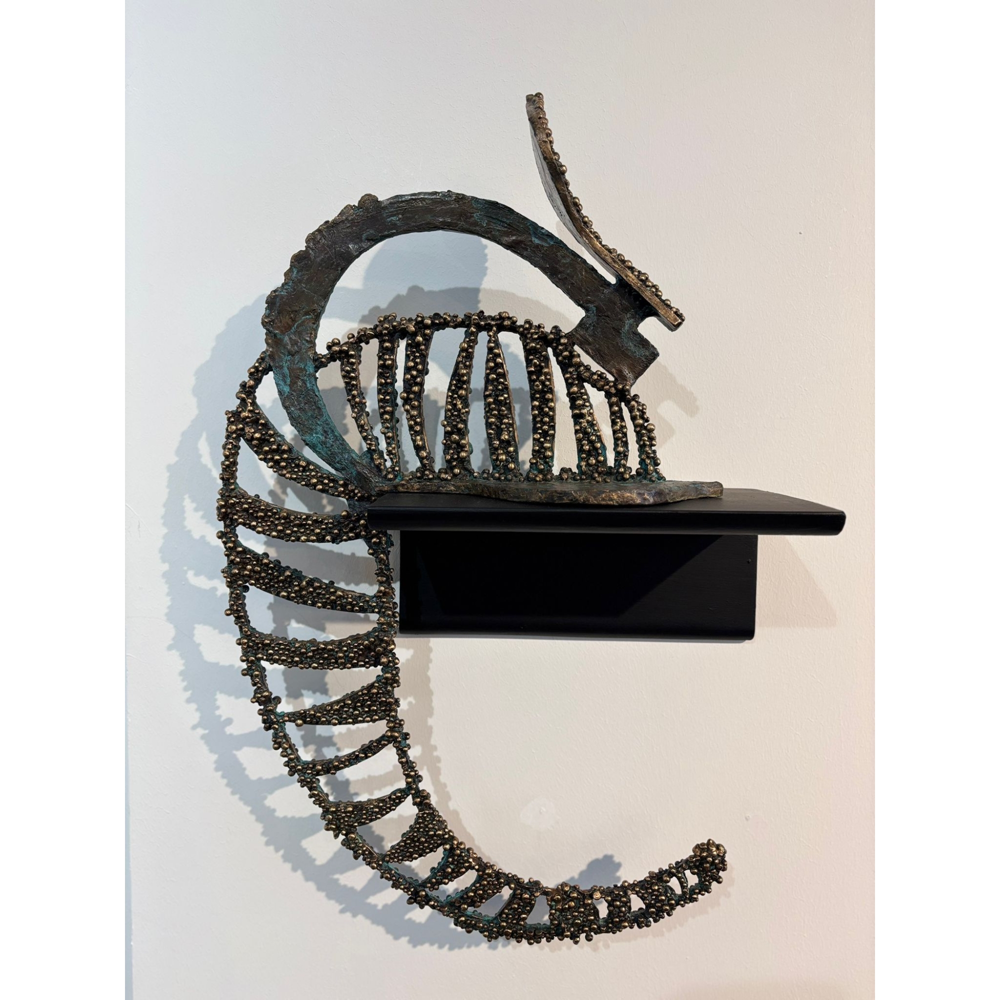 Tafelgast is een bronzen object dat op een houten tafeltje aan de muur hangt. Het is een kopie van Leni's oudere werk dat in aluminium was gegoten. Dit werk is met dezelfde (door de kunstenares zelf gemaakte) mal gemaakt, maar dan in brons. Het werk wordt door Leni zelf bij u thuisgebracht en gemonteerd. Wil je meer weten over dit kunstwerk? Kom naar de galerie of boek een bezichtiging.