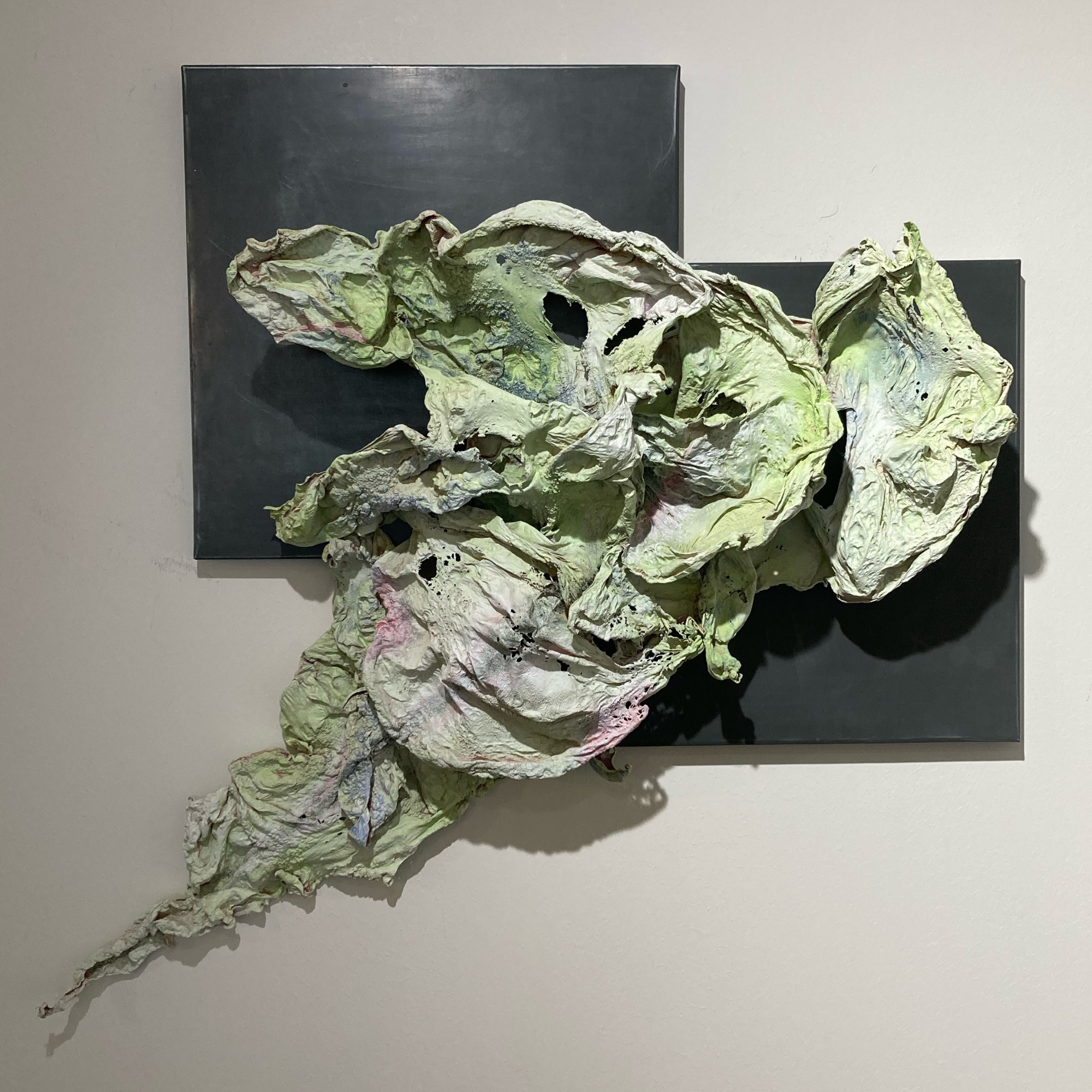 Wanneer moet je uit je schulp kruipen? Of juist erin? Uit zijn schulp is een wandwerk van Tyvek dat is verstevigd met acryl. Het is aangebracht op een drager van zink.