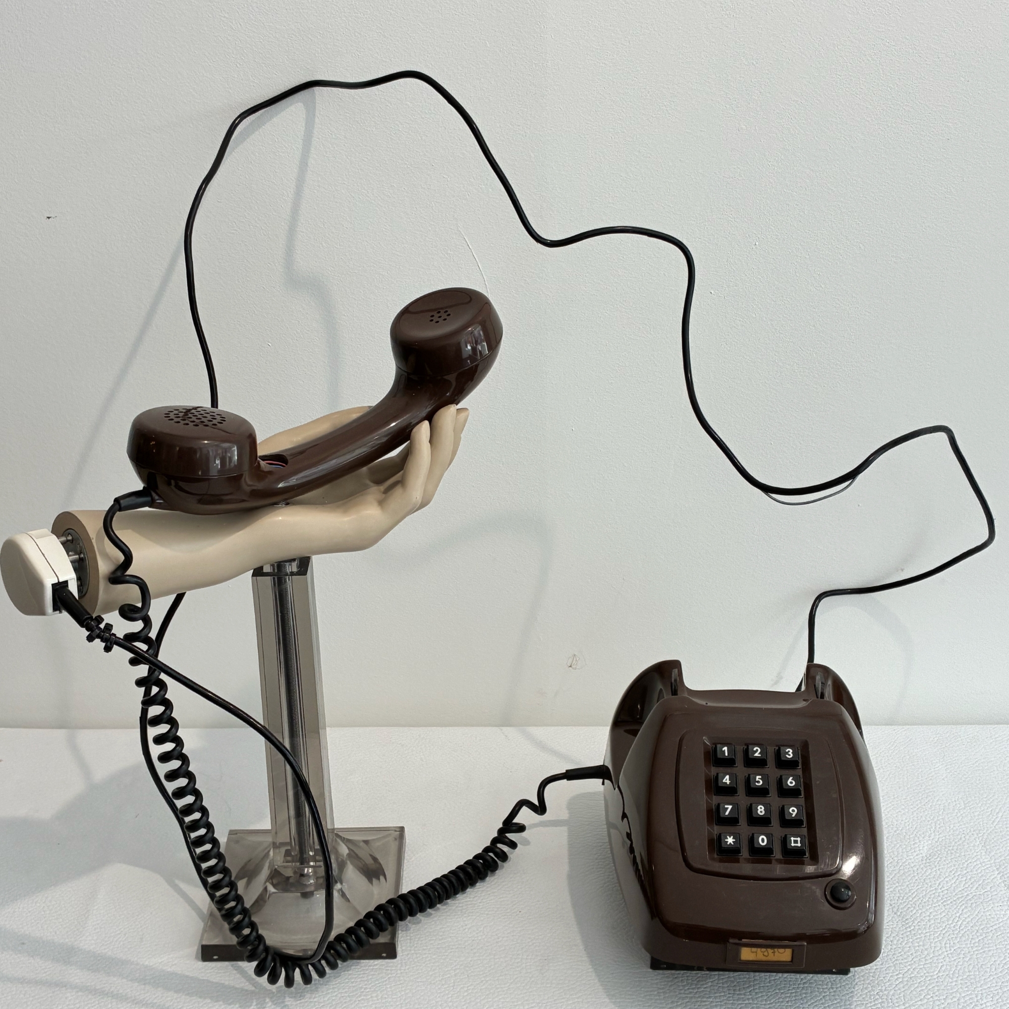 Een kunstwerk in de typische stijl die Saskia Vergunst typeert: een ouderwetse telefoon en een hoorn in de hand die met een telefoonstekker met de telefoon is verbonden. Dit schreef ze er zelf over: e brein proeft de sfeer door de achtergrond die hij creëerde. Het laat je stilstaan in tijd en houdt je vast op die plek. Zoals de beller die zich aan je vastsnoerde tijdens een eenzijdig gesprek, VERKEERD VERBONDEN Wil je meer weten over dit kunstwerk van Saskia Vergunst? Kom naar de galerie of boek een bezichtiging.