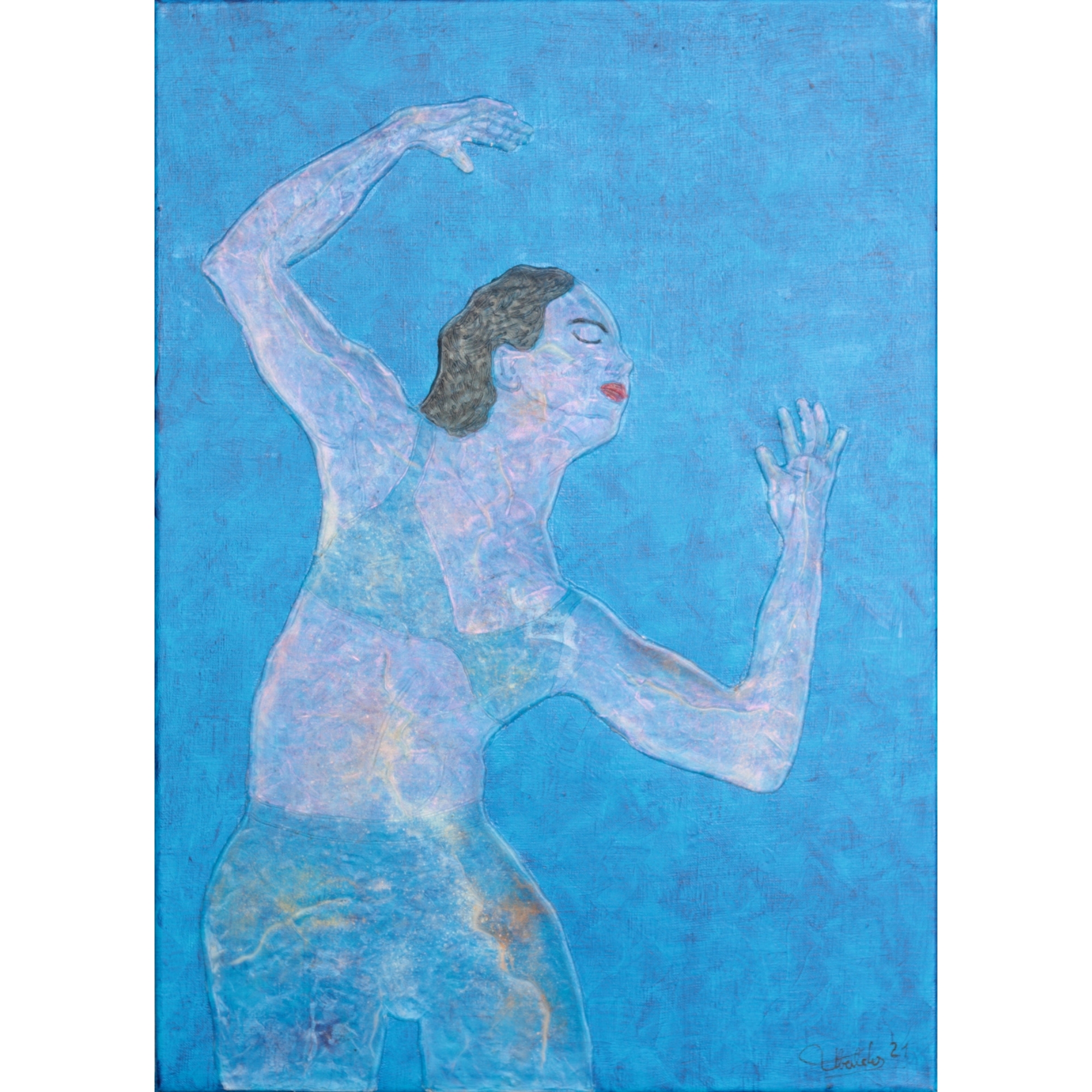 Een uniek kunstwerk in de kenmerkende stijl van Ubaldo Sichi. Op een blauwe achtergrond is met een mal van was een vrouwfiguur in transparant acryl aangebracht. Het werk hangt bij Domo Eclectica in het kader van de expositie 'Vreemd Voer'. Wil je meer weten over dit werk of andere werken van Ubaldo Sichi? Kom naar de galerie of boek een bezichtiging.